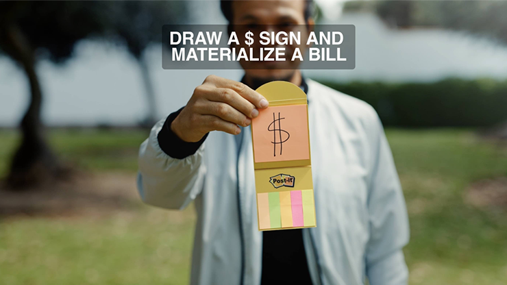 Appearing Bill:The magician draws in a post-it a piece a dollar sign, now he flicks the post-it pad and the written dollar sign transforms into real dollar bill. The perfect way to get instant cash!