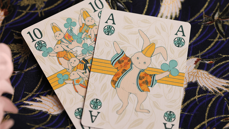 These Number Cards capture the joyous assembly of hares as they herald the coming of the gods. Each card features a unique hare, celebrated in a moment of reverent anticipation. The number cards feature a transformation deck, where the pips elegantly evolve into rabbits.