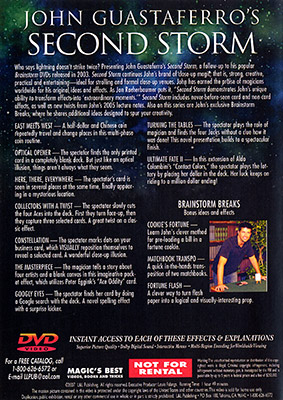Who says lightning doesn't strike twice? Presenting John Guastaferro's Second Storm, a follow-up to his popular Brainstorm DVDs released in 2003. Second Storm continues John's brand of close-up magic; that is, strong, creative, practical and entertaining-ideal for strolling and formal close-up venues. John has earned the praise of magicians worldwide for his original ideas and effects. As Jon Racherbaumer puts it, "Second Storm demonstrates John's unique ability to transform effects into 'extraordinary moments.'" Second Storm includes never-before-seen card and non-card effects, as well as new twists from John's 2005 lecture notes. Also on this series are John's exclusive Brainstorm Breaks, where he shares additional ideas designed to spur your creativity.
