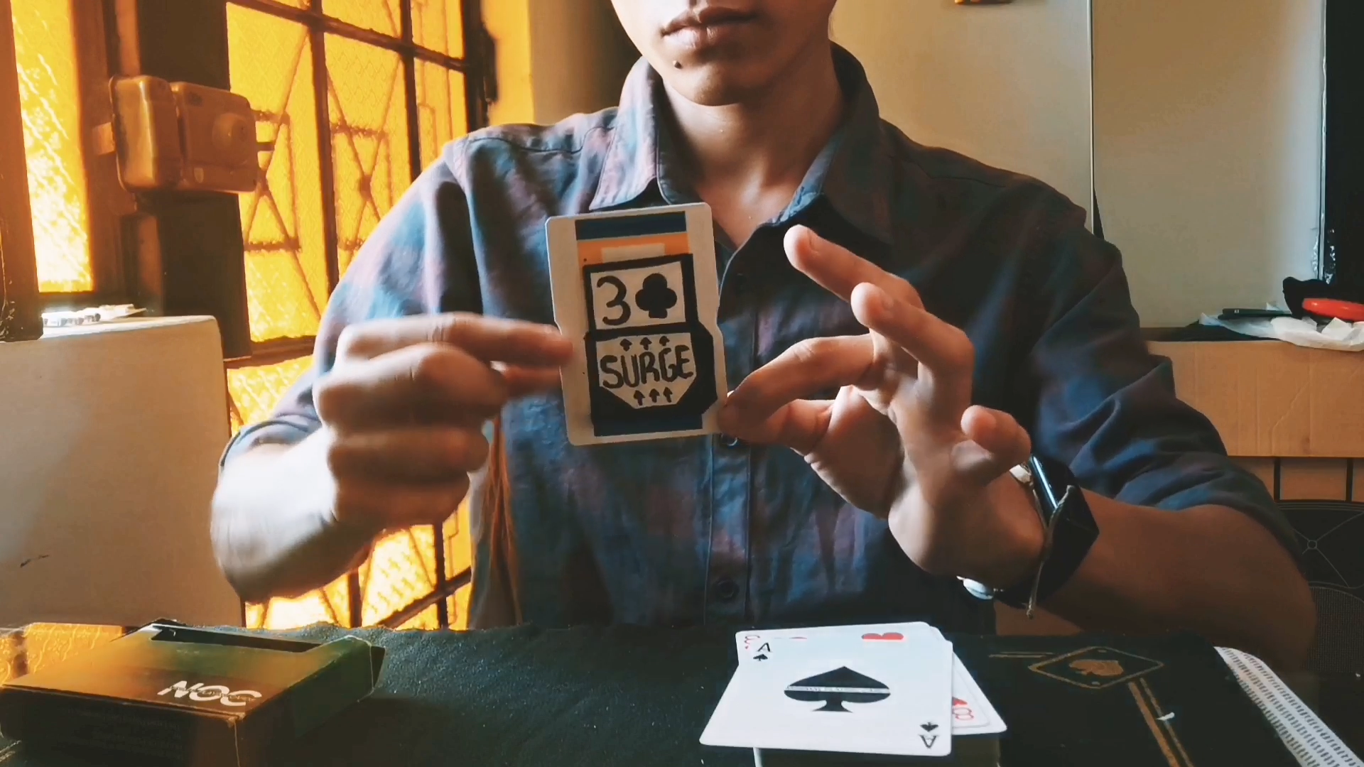 Two spectators draw a card and it is lost inside the deck. The magician takes out a card containing the word Surge. I ask one of the spectators to press the word Surge as it works as a lever and impossibly the card of the first spectator comes out. But the game doesn't end there, I ask the second spectator to imagine that he has his card in his hand and to throw it towards the magician's card. In an unimaginable way his card appears on the magician's card. He then hands it to the spectator so that it can be examined.